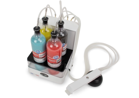 Incluye: dispensador, conexión a la máquina, boquilla dispensadora de 4 vías con base magnética y 4 botellas de plástico.